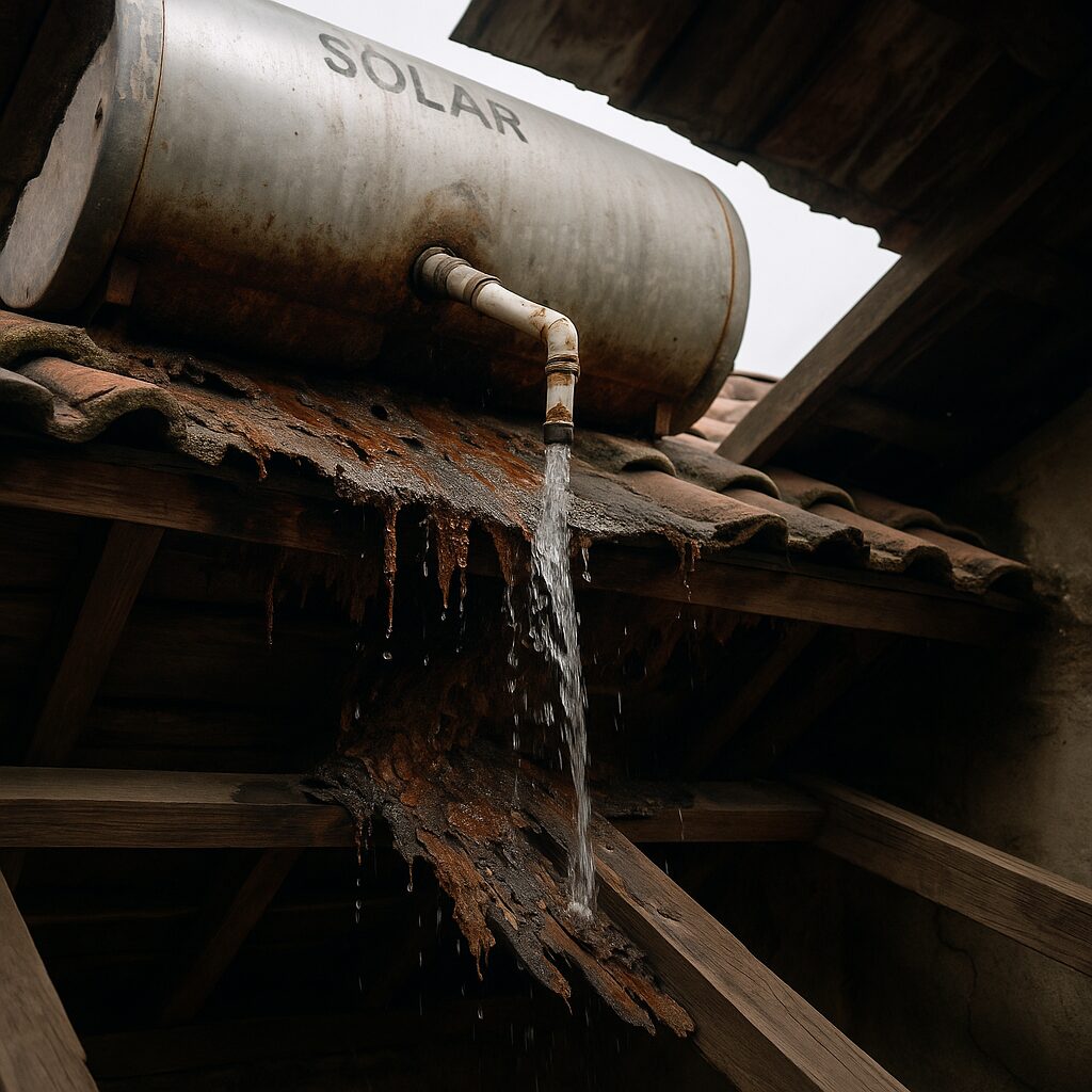 太陽熱温水器の配管は、ゴムパッキンや接続部分の劣化により水漏れを起こします。この水漏れは少量でも継続的に発生するため、気づかないうちに屋根裏の野地板や垂木を腐食させます。