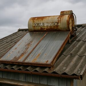 太陽熱温水器を屋根に固定しているワイヤーや金具は、経年劣化により確実に腐食します。特に静岡県の沿岸部では、塩害によりステンレス製のワイヤーでも15〜20年で強度が半減します。
