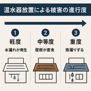 焼津市で施工した事例では、温水器からの微量な水漏れが5年以上続いた結果、野地板が50センチ四方にわたって腐朽し、交換が必要になりました。温水器の撤去費用は8万円でしたが、屋根下地の修理に追加で35万円がかかりました。早期に撤去していれば、この追加費用は不要だったのです。