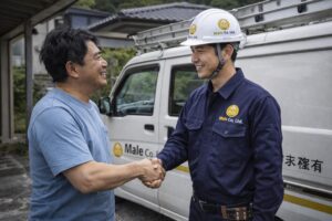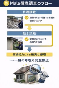 口頭での説明だけでは、原因箇所を正確に理解できません。優良業者は、調査結果を写真付きで提出し、①原因箇所の写真、②雨水の浸入経路の説明、③修理方法の提案、④修理費用の見積もりを明記します。写真がない業者は、調査が曖昧で、根拠のない推測で修理している可能性が高いです。Maleは調査結果を写真付きで詳しく説明し、お客様が納得できるまでサポートします。