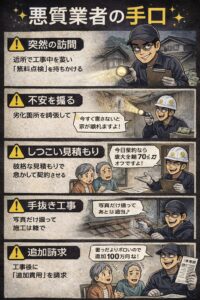 「近所で工事をしていて、お宅の屋根が気になった」と訪問してくる業者は100%悪質業者です。屋根に登って「雨漏りしている」と嘘をつき、高額契約を迫ります。優良業者は訪問営業をしません。